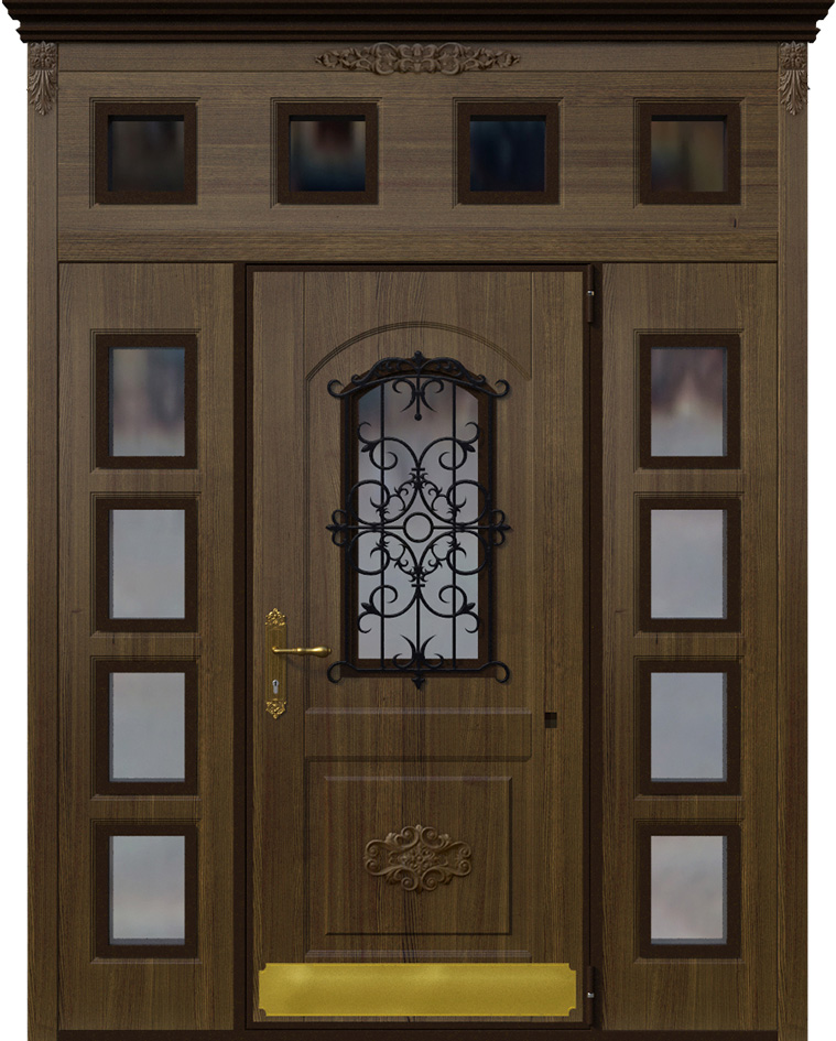 Эта модель выделяется своим масштабом и декоративностью: двухстворчатая дверь со вставками и ковкой №2 подчеркивает парадность входа и придает фасаду респектабельность. Основу составляет прочный каркас из стальных профильных труб с листом металла толщиной 2 мм и ребрами жесткости, что обеспечивает долговечность и защиту. Снаружи и внутри полотно облицовано накладками МДФ, которые позволяют воплотить различные варианты текстур и оттенков, сохраняя устойчивость к механическим повреждениям и влиянию внешней среды. Кованые элементы вносят в образ двери нотку изысканности и индивидуальности, делая ее центральным акцентом всего фасада. Для безопасности предусмотрены два замка турецкого производителя Kale Kilit — цилиндровый и сувальдный, каждый с ригелями, усиливающими защиту. Такая дверь сочетает надежность металлической конструкции с эстетикой классического дизайна, превращая вход в настоящий архитектурный акцент. Двухстворчатая дверь со вставками и ковкой №2 от производителя: быстрое изготовление и монтаж в Софрино, индивидуальные размеры, широкий выбор материалов и фурнитуры, официальная гарантия до 10 лет.