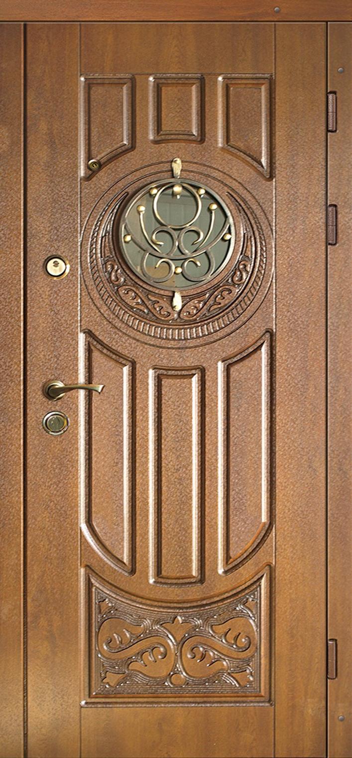 Входная металлическая дверь для частного дома со стеклом и ковкой №29