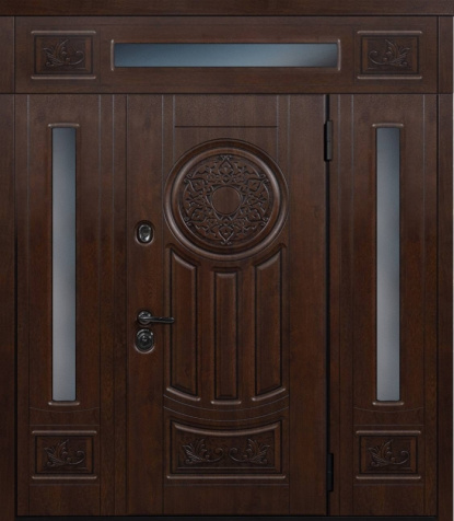 Если проём очень широкий, но не хочется устанавливать двустворчатую модель, используют комбинированные решения. Например, широкая входная дверь со стеклом или глухими боковыми вставками. По бокам основной створки могут быть узкие неподвижные панели: они уменьшают фактическую ширину открывающейся части и украшают вход. Такие вставки нередко содержат стеклопакет с декоративной решёткой или ковкой – подобный дизайн популярен для загородных коттеджей. Остекление выполняется из ударопрочного материала, чтобы дверь оставалась надёжной и безопасной.