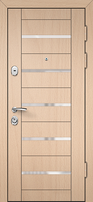 Эта бронированная дверь в современном дизайне №28 станет отличным решением для частного дома, квартиры или офиса, предлагая надежную защиту и стильный внешний вид. Ее конструкция включает каркас из профильной трубы 50х25 мм и металлическое полотно толщиной 2 мм, что обеспечивает прочность и долговечность. Внешняя и внутренняя отделка выполнены из плиты МДФ, придающей двери современный вид и стойкость к механическим повреждениям. Хотя терморазрыв отсутствует, конструкция с терморазрывом коробки и полотна помогает снижать теплопотери. Дополнительную безопасность обеспечивают два замка — сувальдный и цилиндровый, оба с тремя ригелями. В дверь можно добавить зеркало, стеклопакет или кованые элементы, а также установить видеодомофон, что делает эту модель максимально универсальной и индивидуальной. Бронированная дверь в современном дизайне №28 от производителя: быстрое изготовление и монтаж в Софрино, индивидуальные размеры, широкий выбор материалов и фурнитуры, официальная гарантия до 10 лет.