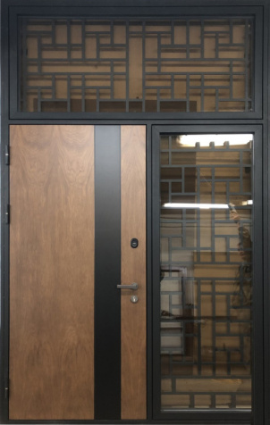 Дизайнерская входная дверь в частный дом с отделкой под дерево и решеткой №17