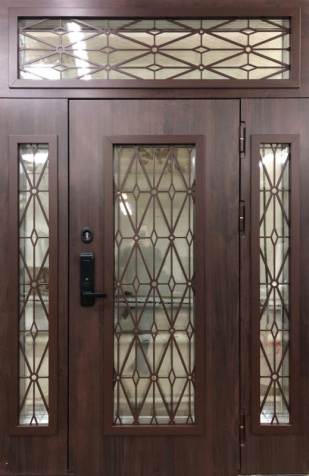 Высокая входная дверь с коваными элементами и фрамугой №5